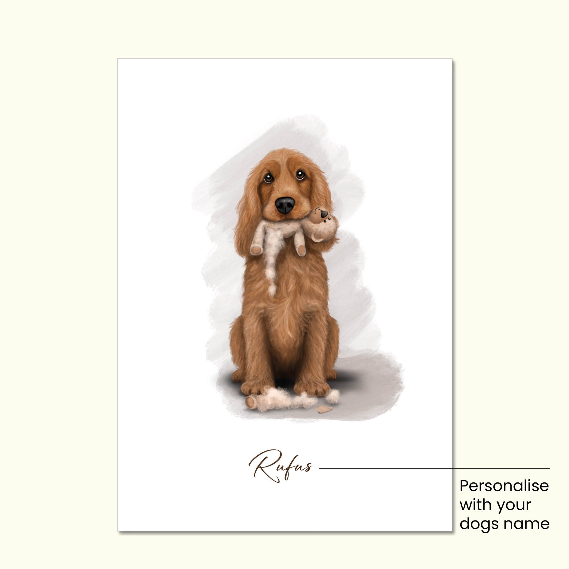 Say goodbye to your beloved stuffed toys and hello to this quirky custom Cocker Spaniel art print. RIP Teddy features a mischievous pup with a torn up teddy in its mouth - a playful and relatable reminder of our furry friends' antics.