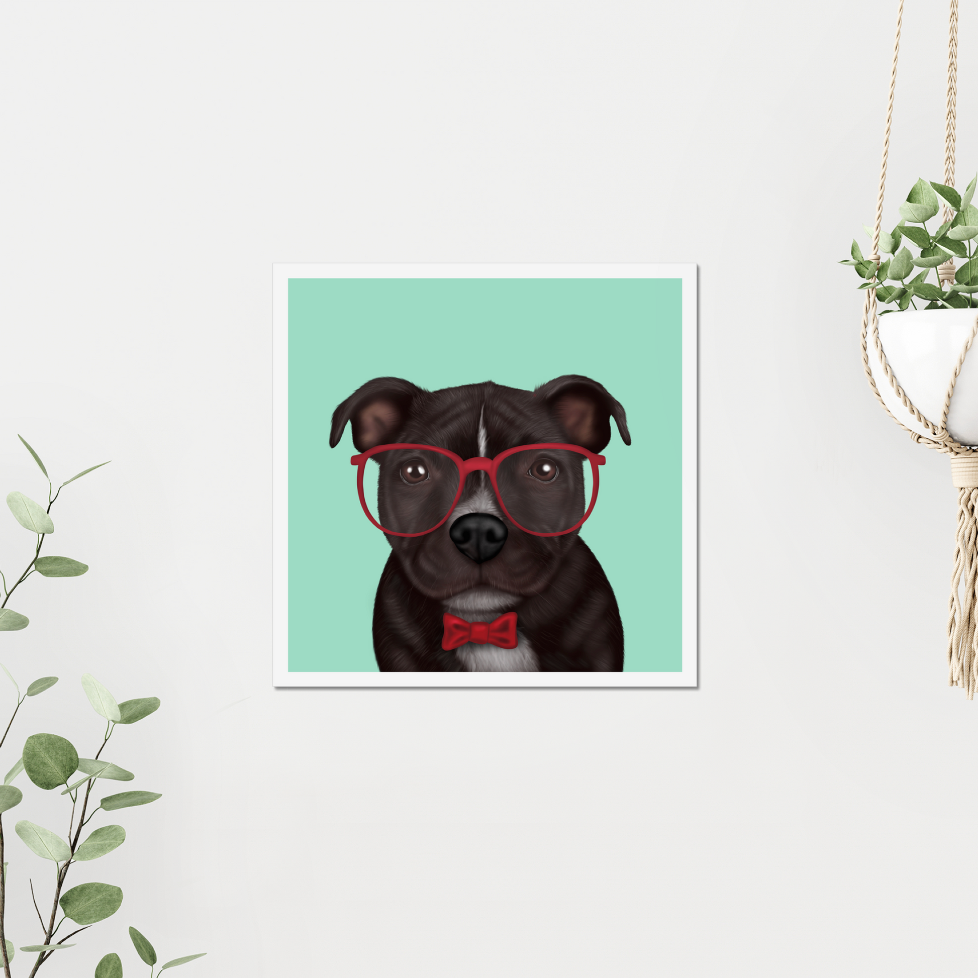 Introducing Staffy in Glasses - the cutest (and smartest!) art print around! This pooch-tastic Staffordshire Bull Terrier is wearing glasses and a bow tie, and ready to spruce up your space with some funky fun-time vibes. So why not take a leaf out of Staffy's book and give your home a little extra sparkle with our Staffordshire Bull Terrier print?!